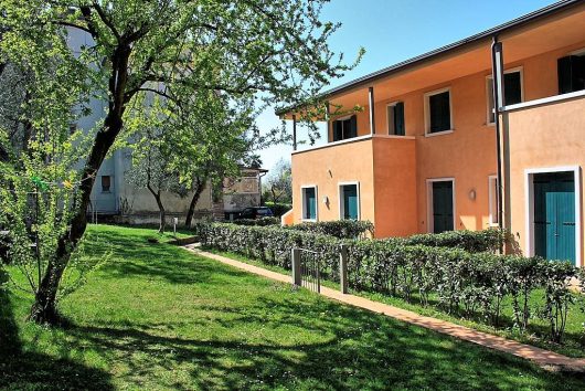 Das Haus verfügt über einen großen Garten zum See hin, der durch Blumenbeete unterteilt ist, die den Bereich für jede Wohnung abgrenzen.